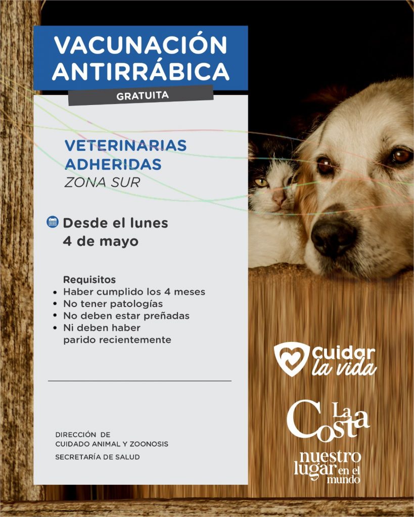 La Municipalidad de La Costa informa que, a partir del próximo lunes 4 de mayo, se pondrá en marcha la campaña gratuita de vacunación antirrábica para perros y gatos.