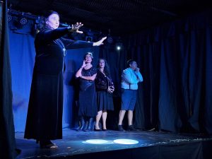 El elenco está integrado por Gabriela Marinsalta, Carlos Bron, Roxana Bergerot y Claudia Zappino, artistas con trayectoria en el circuito independiente, quienes sostienen una propuesta escénica basada en el compromiso actoral y en el vínculo directo con el espectador, que sigue la obra desde sus mesas con la posibilidad de degustar un refrigerio mientras se desarrolla la función.