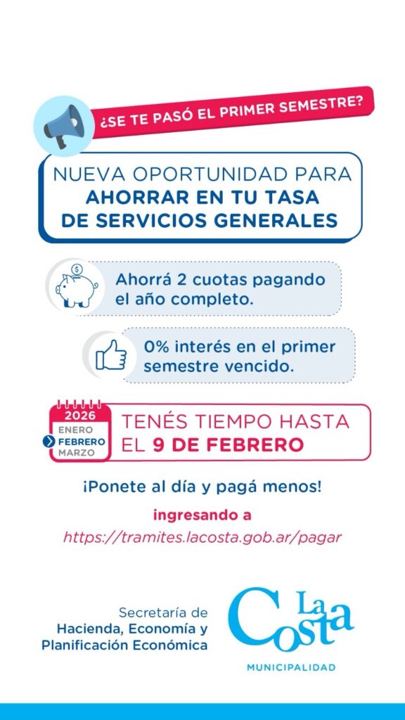 La Municipalidad de La Costa recuerda que hasta el próximo lunes 9 de febrero continúa vigente el beneficio por pago anticipado de las tasas municipales correspondientes al año 2026, una alternativa que permite a los contribuyentes planificar el año y acceder a descuentos concretos.